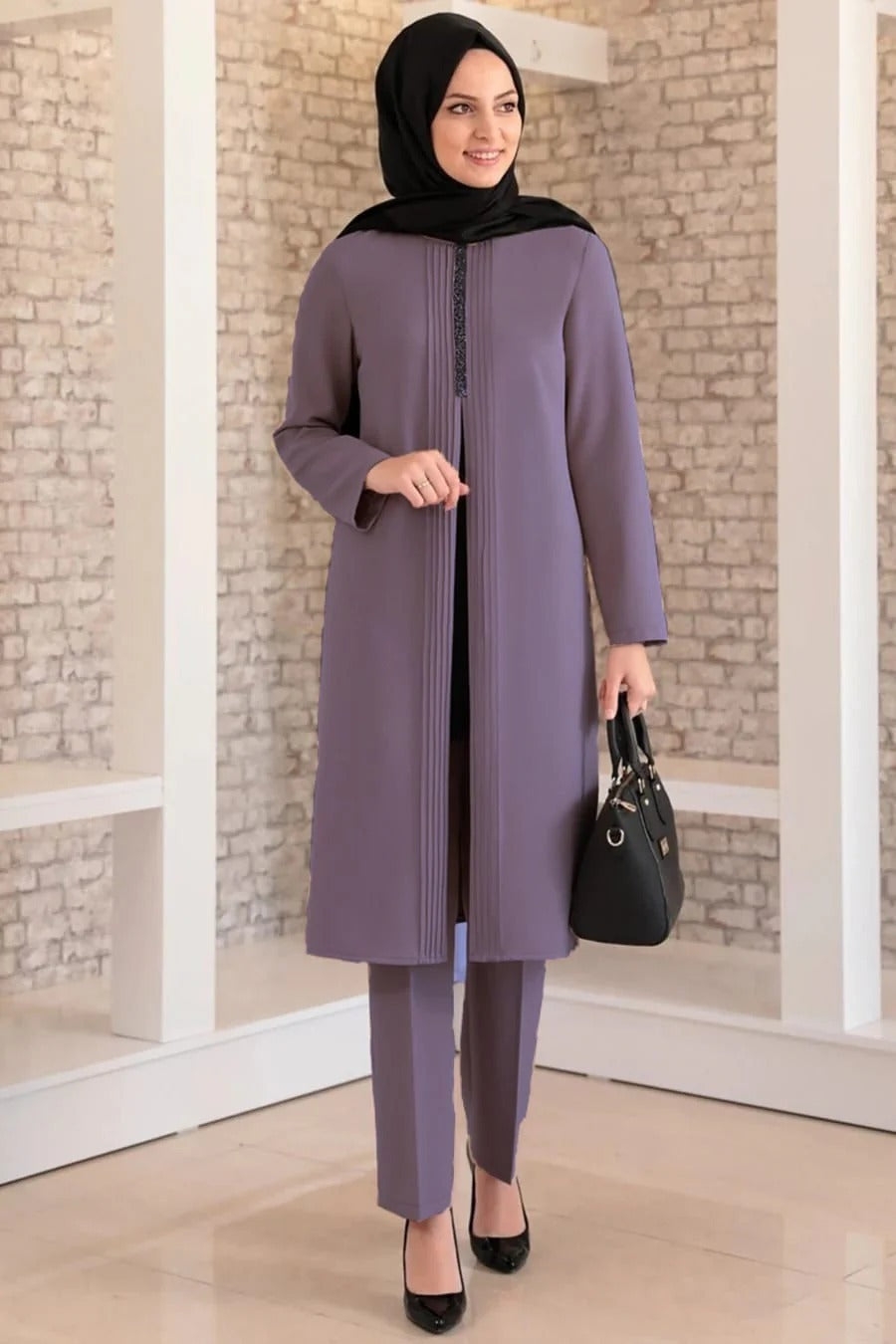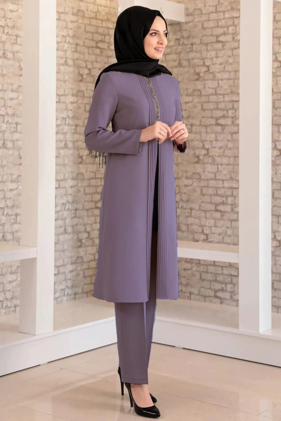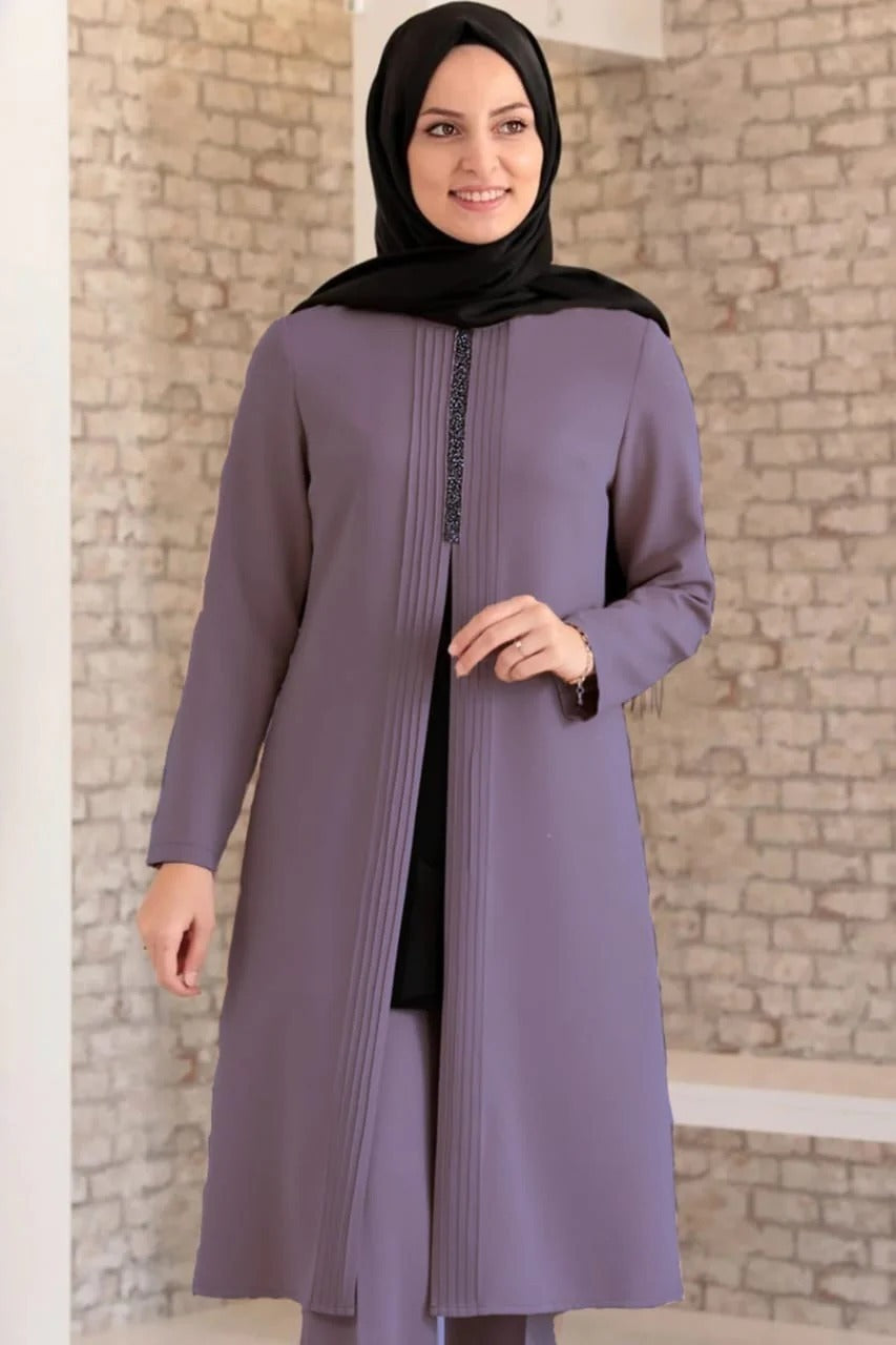 It is produced using Dabil crepe. The tunic-like piece in it is combined. It is a comfortable fit and it is recommended to order in your own size. Tunic length 120 cm, trouser length 105 cm. The length of the mannequin is 178 cm.